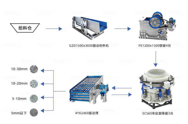 主機設備包括GZD1500x3600振動給料機、PE1200x1500顎破4臺、SC560單缸圓錐破3臺、4YK2460振動篩。