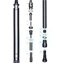 活塞、內缸、配氣座、逆止閥和鉆頭附件等安裝在細長的外缸內,外缸上端裝帶扳手口和聯(lián)接螺紋的上接頭,下端裝有螺紋連接的卡釬套。