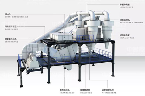 從選粉樓內部結構圖可以看到,設備主要由緩沖倉、動態選粉機、靜態選粉機、風機、循環管道、風選室、砂石分離器、螺旋輸送機、級配調節裝置等部分組成。