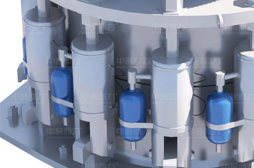 1、采用主軸固定、偏心套繞主軸旋轉(zhuǎn)的多缸液壓圓錐破結(jié)構(gòu);