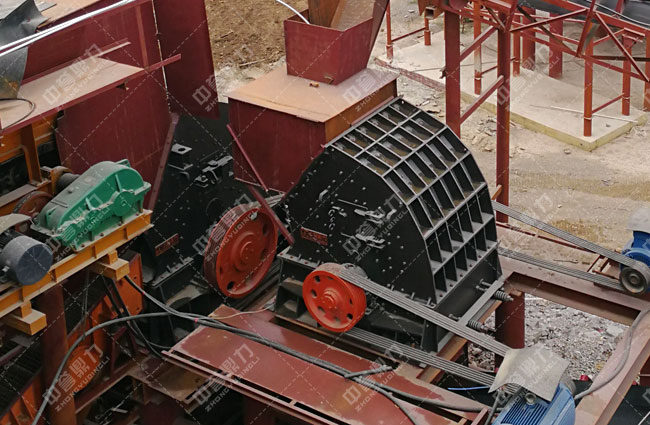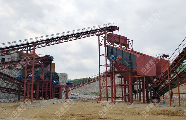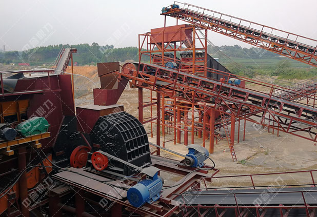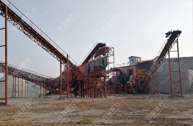 石料由ZGC2038振動給料機均勻地送到頭破(PCZ1815重型錘式反擊破碎機)進行粗破,粗破后的物料由膠帶輸送機送入到二破(XPC1216錘式破碎機)進行細碎,細碎后的物料被輸送到兩道并篩中進行篩分,篩分出五種不同規格的成品料,由輸送帶送到成品料堆。成品粒度可按用戶的需求進行組合和分級。