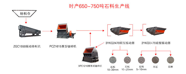 選用設備:ZG2050振動給料機,PCZ1820重型錘式破碎機,PCZ1620整形破碎機,3YKZ3070振動篩*3,2YKZ3070振動篩*2和輸送帶等設備。